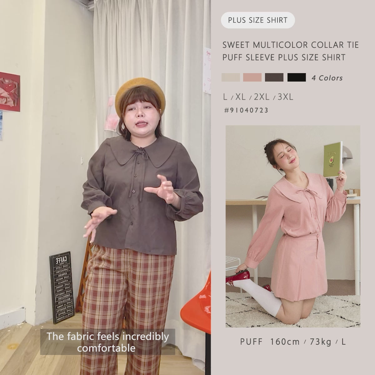 Sweet Multicolor Collar Tie Puff Sleeve Plus Size Shirt